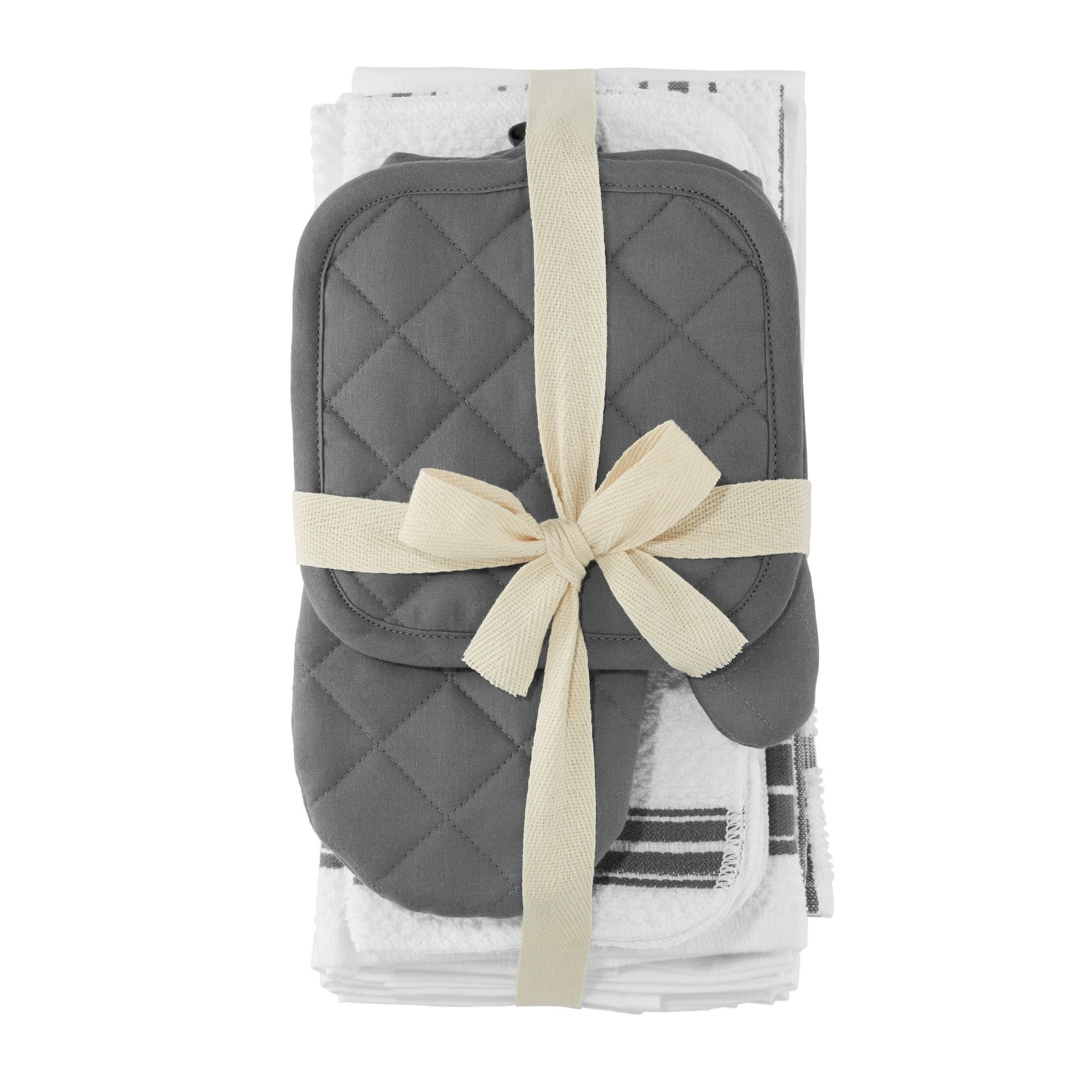 Includes: 2 terry kitchen towels 15" x 25", 2 flat kitchen towels 15" x 25", 4 terry dish cloths 12" x 12", 4 scrubber dish cloths 12" x 12", 4 flour sack kitchen towels 28" x 29", 2 oven mitts 7" x 10", 2 pot holders 7" x 7"Kitchen towels and dish cloths are made from 100% cottonTerry scrubber dish cloths are made from 100% cotton with 100% polyester netOven mitts and pot holders are made with 100% cotton shells and 100% polyester fillTerry kitchen towels, dish cloths, and scrubber dish cloths: machine wash cold with like colors, do not bleach, tumble dry low, remove promptly from dryer, do not ironFlour sack kitchen towels: machine wash cold with like colors, do not bleach, tumble dry low, remove promptly from dryer, warm iron when neededOven mitts and pot holders: machine wash cold with like colors, delicate cycle, do not bleach, remove promptly, lay flat to dry, warm iron when neededAvailable in blue and white or gray and whiteImported