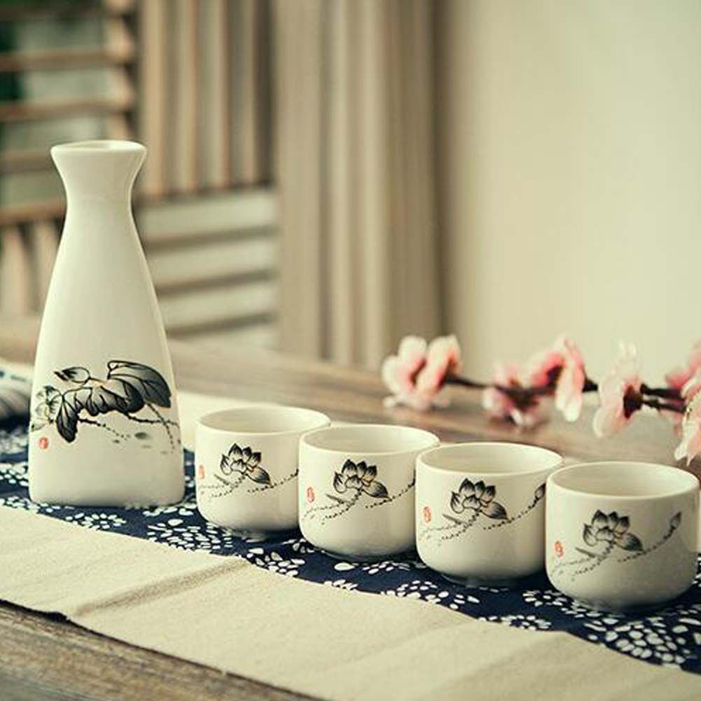 5 Piece Japanese Sake Set Handmade Ceramic Wine Cup Home Decor Sake Cup, Lotus