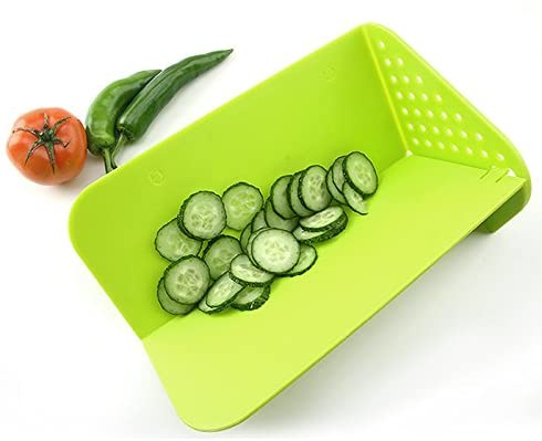 * Special Designed - After cutting, folds to form a neat strainer at one end to rinse food, sliced foods into bowls, pots, pans and plates.Especially helpful in cutting and rinsing vegetables and fruits.