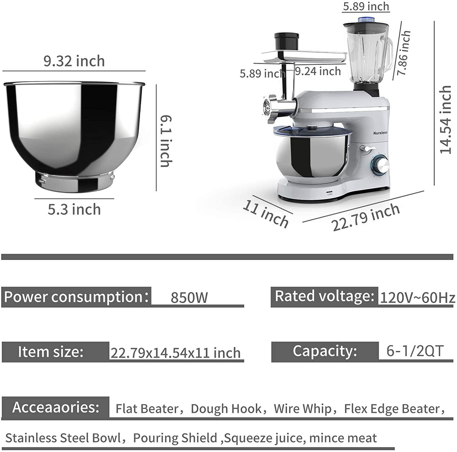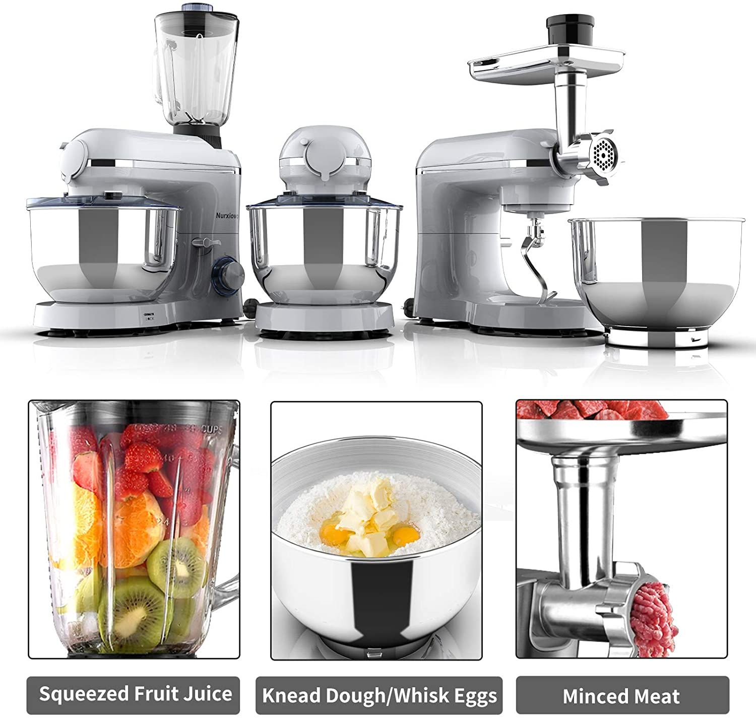 EASY BAKING RELEASE HANDS- 3 in 1 stand mixer with meat grinder and juice extractor. Easy to use for making cakes, breads, cookies, pastry, muffins waffle and easy to squeeze juice and easy to mince meat at the same time .Also with splash guard helps add ingredients without making a mess.6+PULSE SPEED AND BLUE LIGHT - Nurxiovo electric mixer is ETL listed. With handy 6-speed control access to multipurpose and a variety of recipes. Pulse can reach the highest speed in a second, used to beat egg whites.When plugged, In the speed control is backlight to remind you to unplug the machine when you're done with it.850W POWER MOTOR - Pure copper motor and sturdy ABS housing makes the process quickly and thoroughly. Built-in chip sensor temperature automatically shut down when overheating, safety and security.American standard plug, wire length about 1.05 m. New design, lowest noise <72dB6.5QT LARGE CAPACITY STAINLESS STEEL BOWL - Food grade stainless steel - heat insulation, bright surface, easy to scrub , 6.5QT Large stainless bowl is enough to mix dough for 9 dozen cookies or 4 loaves of bread in a single batch.You can enjoy baking follow your heart.TILT -HEAD AND ANTI-SLIP DESIGN- Tilt-head kitchen mixer not only allows clear access to the bowl and attached beater, but also easy to install and remove stainless bowl and 3 attachments .With Strong suction feet to reduce noise.1111