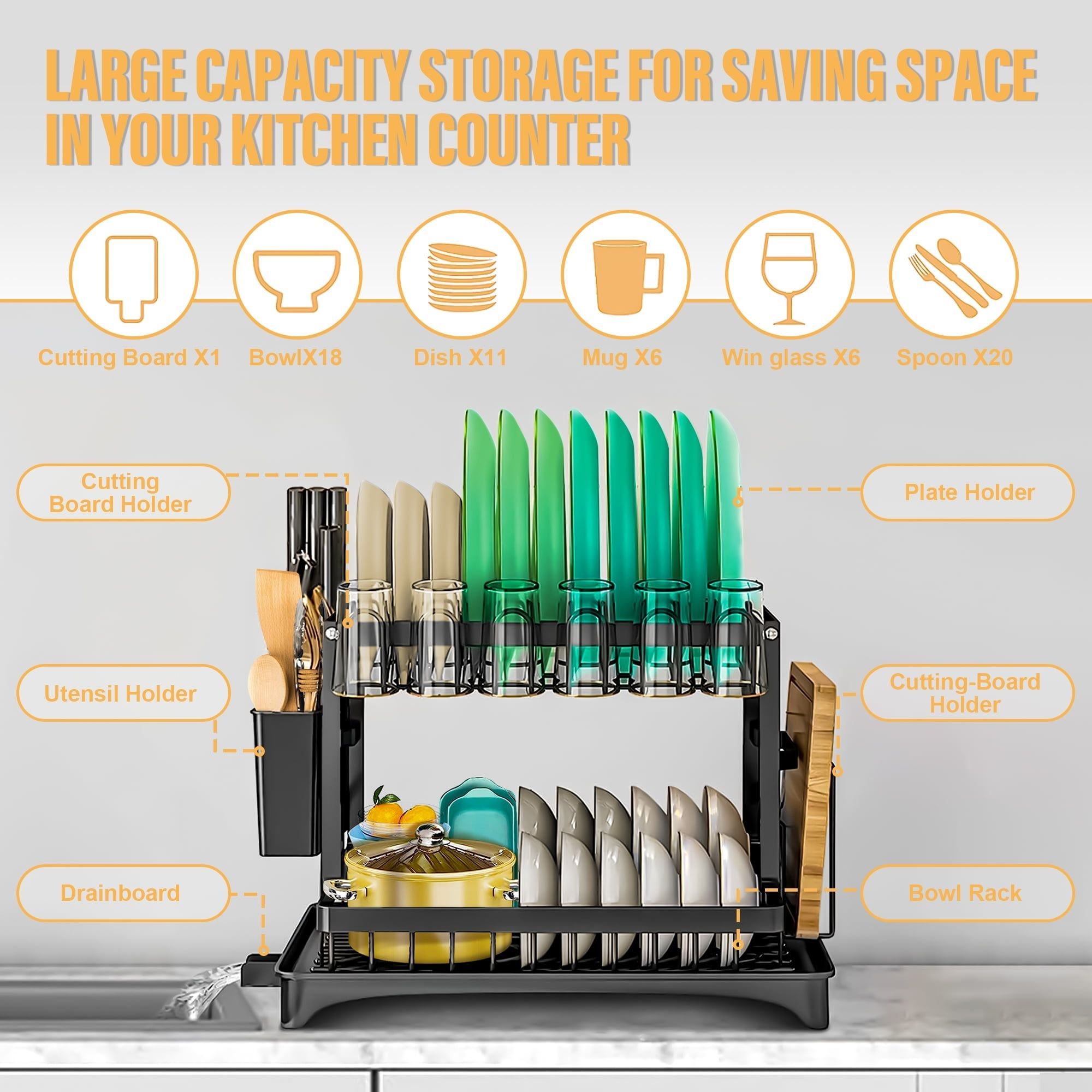 Space-Saving Design: The 2-tier dish rack is compact and designed to save space, holding up to 11 plates, 6 glasses, 18 bowls, and various utensils.