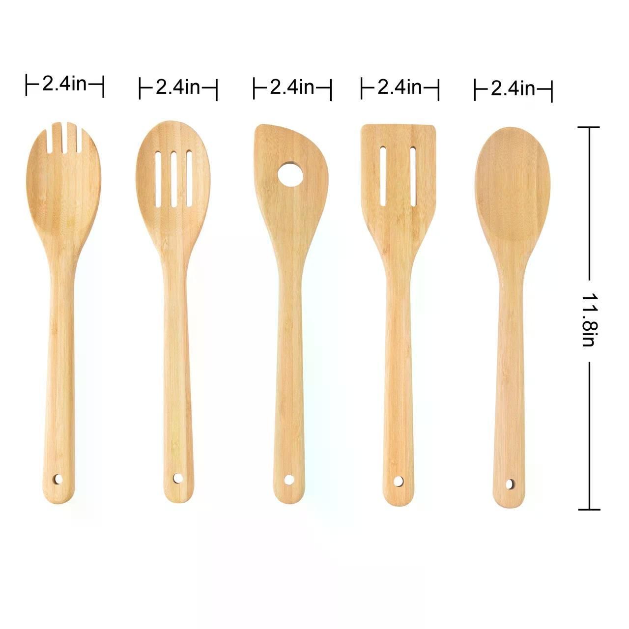 Bamboo Kitchen Tool Set 5 Pieces Utensils are made of bamboo. It has a beautiful natural color and is very environmentally friendly. But please note that it can only be washed by hand and is not suitable for machine washing, and please stay away from open flames when cooking. The size of these five different kinds of tools is 11.8*2.4in and they can be used for stir-frying, serving, filtering, and mashing food. This ensures that you're cooking conveniently. They are very helpful and multifunctional, as well as stand up to the demands of everyday cooking in the home.