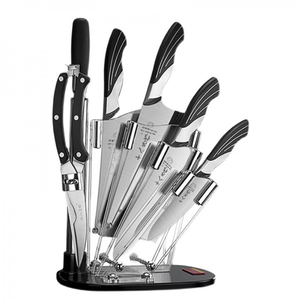 1. Set includes cleaver, slicing knife, multi-purpose knife, fruit knife, kitchen scissors, knife sharpener, knife holder, special knife.